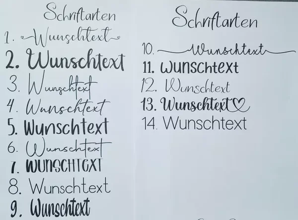 Es steheneuch 14 Schriftarten zur Auswahl, bitte gebt dies unbedingt bei der Personalisierung mit an.